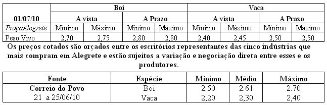 As médias dos remates de gado geral, realizados no Parque Dr. Lauro, no período de 21 a 25 de junho foram as seguintes: