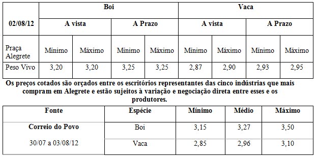 Os preços vigentes no mercado agropecuário desta semana atingiram as seguintes cotações médias
