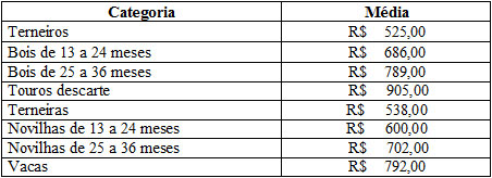 Os preços vigentes no mercado agropecuário desta semana atingiram as seguintes cotações médias: