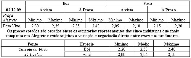 Os preços vigentes no mercado agropecuário desta semana atingiram as seguintes cotações médias: