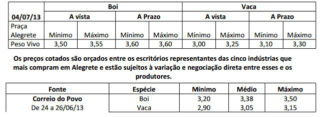 As médias dos remates de gado geral, realizados no Parque Dr. Lauro Dornelles, no período de 24 a 28 de junho foram as seguintes: