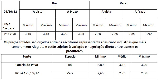 Os preços vigentes no mercado agropecuário desta semana atingiram as seguintes cotações médias: