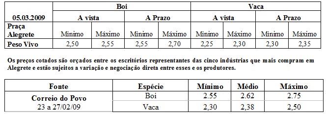 Os preços vigentes no mercado agropecuário desta semana atingiram as seguintes cotações médias: