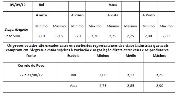 Os preços vigentes no mercado agropecuário desta semana atingiram as seguintes cotações médias