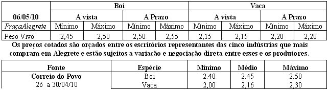 Os preços vigentes no mercado agropecuário desta semana atingiram as seguintes cotações médias: