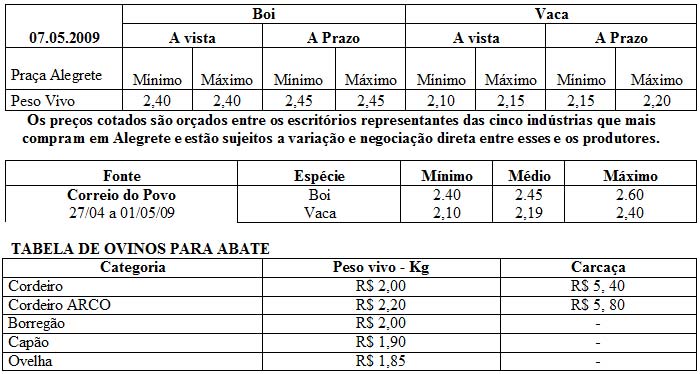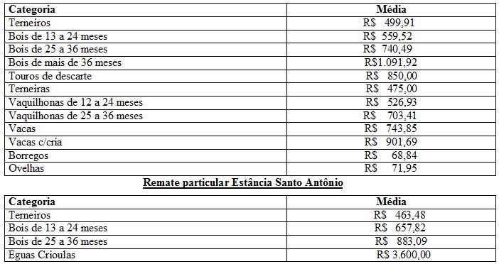 As médias dos remates de gado geral, realizados no Parque Dr. Lauro, no período de 27 de abril a 1º de maio, foram as seguintes: