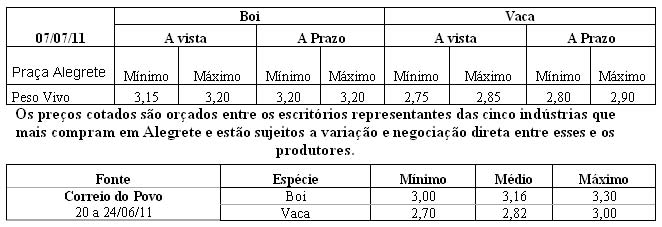 As médias dos remates de gado geral, realizados no Parque Dr. Lauro, no período de 27 de junho a 01 de julho foram as seguintes: