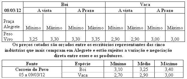 As médias dos remates de gado geral, realizados no Parque Dr. Lauro, no período de 27 de fevereiro a 02 de março foram as seguintes: