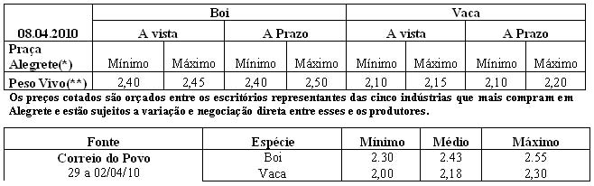 As médias dos remates de gado geral, realizados no Parque Dr. Lauro, no período de 22 a 26 de março foram as seguintes: