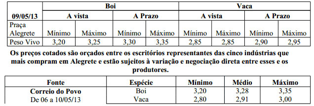Os preços vigentes no mercado agropecuário desta semana atingiram as seguintes cotações médias: