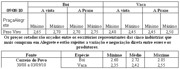 Os preços vigentes no mercado agropecuário desta semana atingiram as seguintes cotações médias: