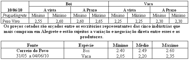 As médias dos remates de gado geral, realizados no Parque Dr. Lauro, no período de 31 de maio a 04 de junho foram as seguintes: