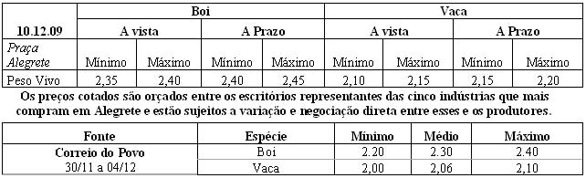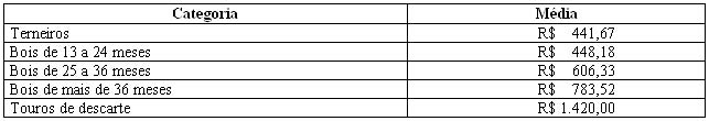 As médias dos remates de gado geral, realizados no Parque Dr. Lauro, no período de 01 a 03 de dezembro foram as seguintes: