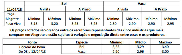 As médias dos remates de gado geral, realizados no Parque Dr. Lauro Dornelles, no período de 01 a 05 de abril foram as seguintes: