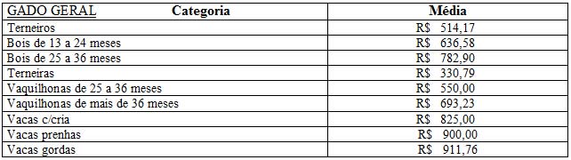 As médias dos remates de gado geral, realizados no Parque Dr. Lauro, no período de 1º a 05 de junho, foram as seguintes: