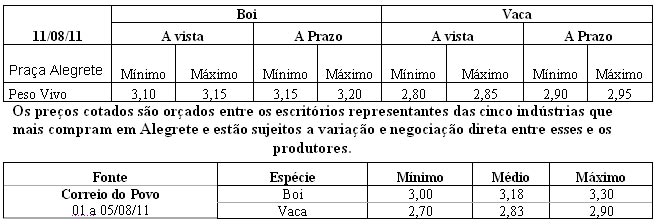Os preços vigentes no mercado agropecuário desta semana atingiram as seguintes cotações médias:
