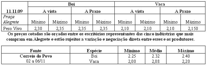 Os preços vigentes no mercado agropecuário desta semana atingiram as seguintes cotações médias: