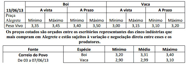 As médias dos remates de gado geral, realizados no Parque Dr. Lauro Dornelles, no período de 03 a 07 de junho foram as seguintes: