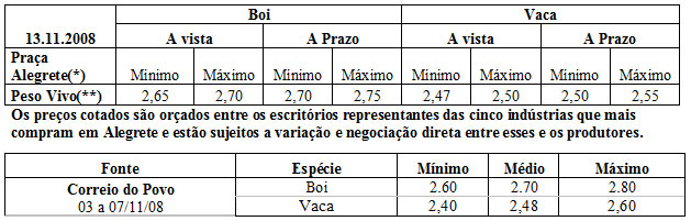 As médias dos remates de gado geral, realizados no Parque Dr. Lauro Dornelles, na semana de 02 a 09 de novembro, foram as seguintes: