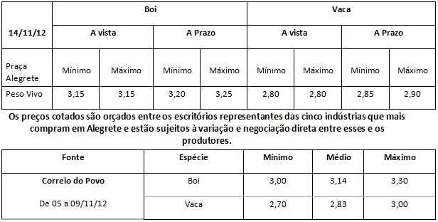 Os preços vigentes no mercado agropecuário desta semana atingiram as seguintes cotações médias: