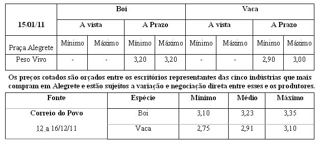 Os preços vigentes no mercado agropecuário desta semana atingiram as seguintes cotações médias