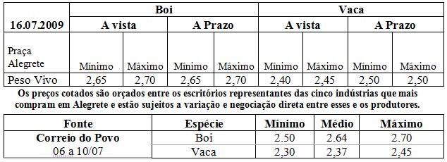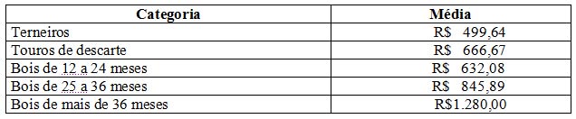 As médias dos remates de gado geral, realizados no Parque Dr. Lauro, foram as seguintes: