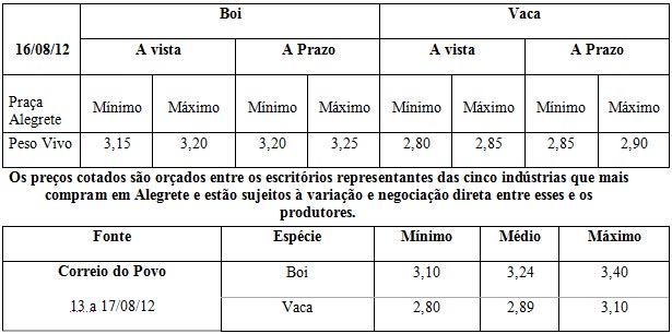 Os preços vigentes no mercado agropecuário desta semana atingiram as seguintes cotações médias