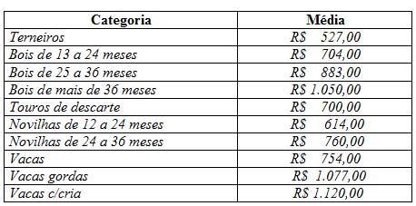 Os preços vigentes no mercado agropecuário desta semana atingiram as seguintes cotações médias:
