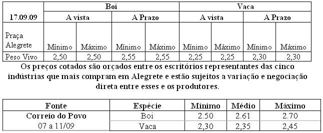 As médias dos remates de gado geral, realizados no Parque Dr. Lauro, no período de 07 a 11 de setembro, foram as seguintes