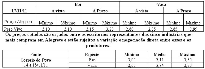 Os preços vigentes no mercado agropecuário desta semana atingiram as seguintes cotações médias: