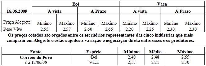 Os preços vigentes no mercado agropecuário desta semana atingiram as seguintes cotações médias: