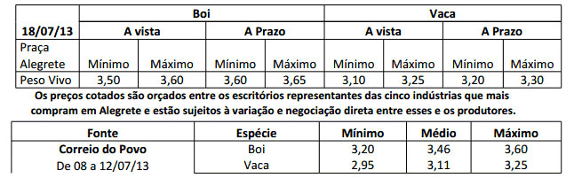 Os preços vigentes no mercado agropecuário desta semana atingiram as seguintes cotações médias: