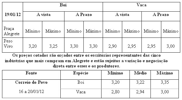 As médias dos remates de gado geral, realizados no Parque Dr. Lauro, no período de 09 de a 14 de janeiro foram as seguintes: