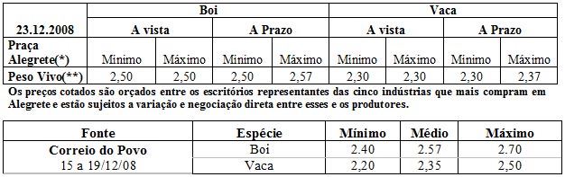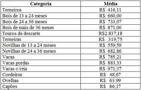Os preços vigentes no mercado agropecuário desta semana atingiram as seguintes cotações médias: