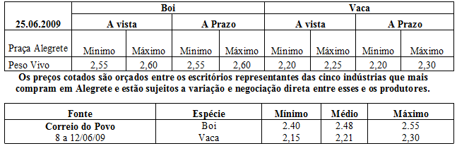 Os preços vigentes no mercado agropecuário desta semana atingiram as seguintes cotações médias: