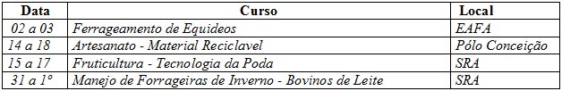 Na última semana ocorreu reunião entre o Sindicato Rural, Senar-RS e parceiros para definir o calendário de cursos de setembro, de acordo com o período e demandas necessárias. Para o mês de julho o Sindicato Rural e o Senar oferecem os seguintes cursos: