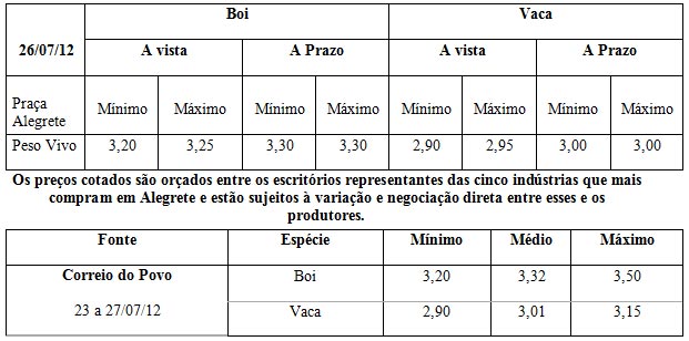 Os preços vigentes no mercado agropecuário desta semana atingiram as seguintes cotações médias
