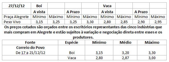 Os preços vigentes no mercado agropecuário desta semana atingiram as seguintes cotações médias: