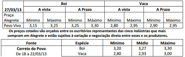 Os preços vigentes no mercado agropecuário desta semana atingiram as seguintes cotações médias: