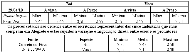Os preços vigentes no mercado agropecuário desta semana atingiram as seguintes cotações médias: