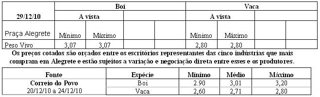 Os preços vigentes no mercado agropecuário desta semana atingiram as seguintes cotações médias: