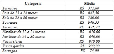 Os preços vigentes no mercado agropecuário desta semana atingiram as seguintes cotações médias: